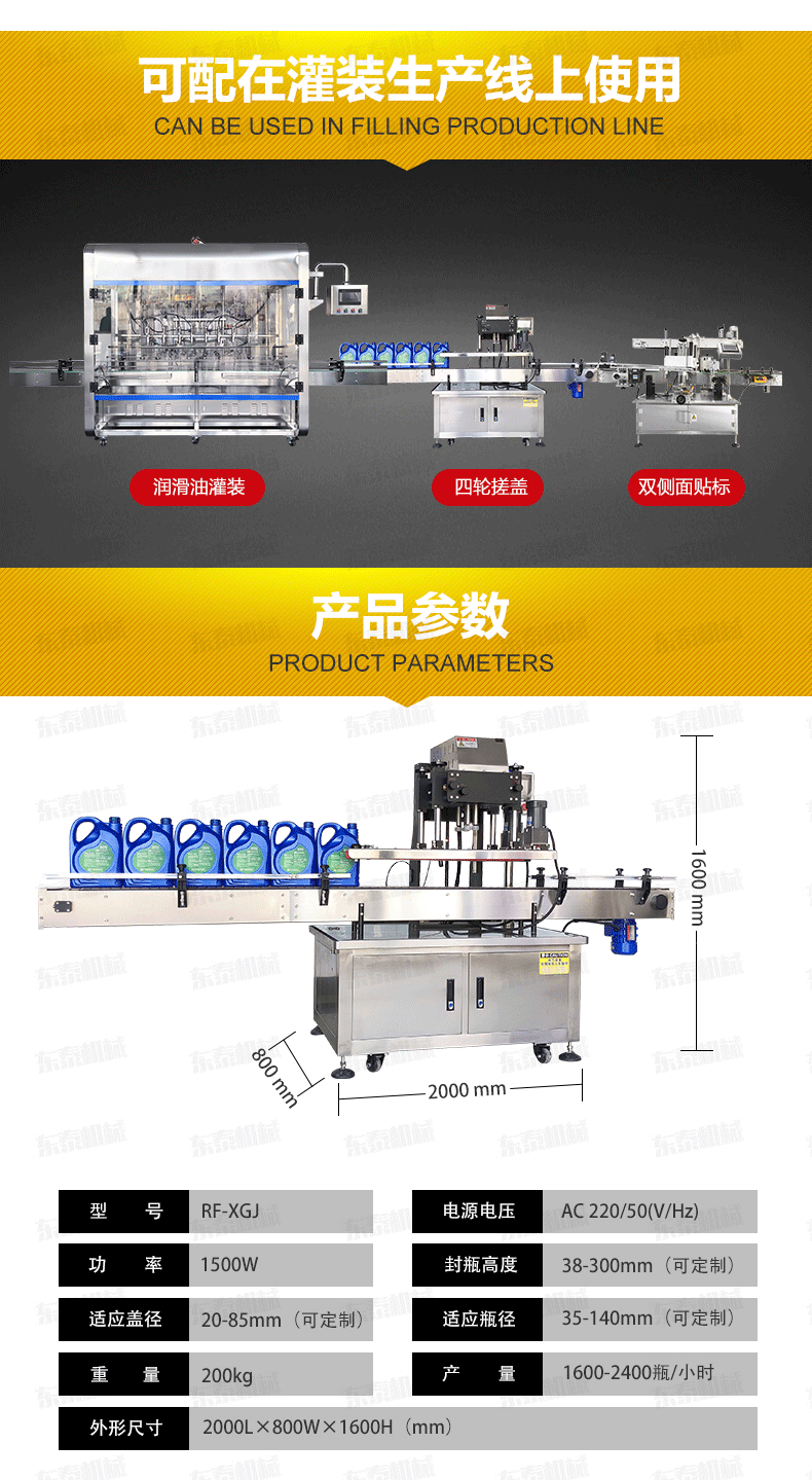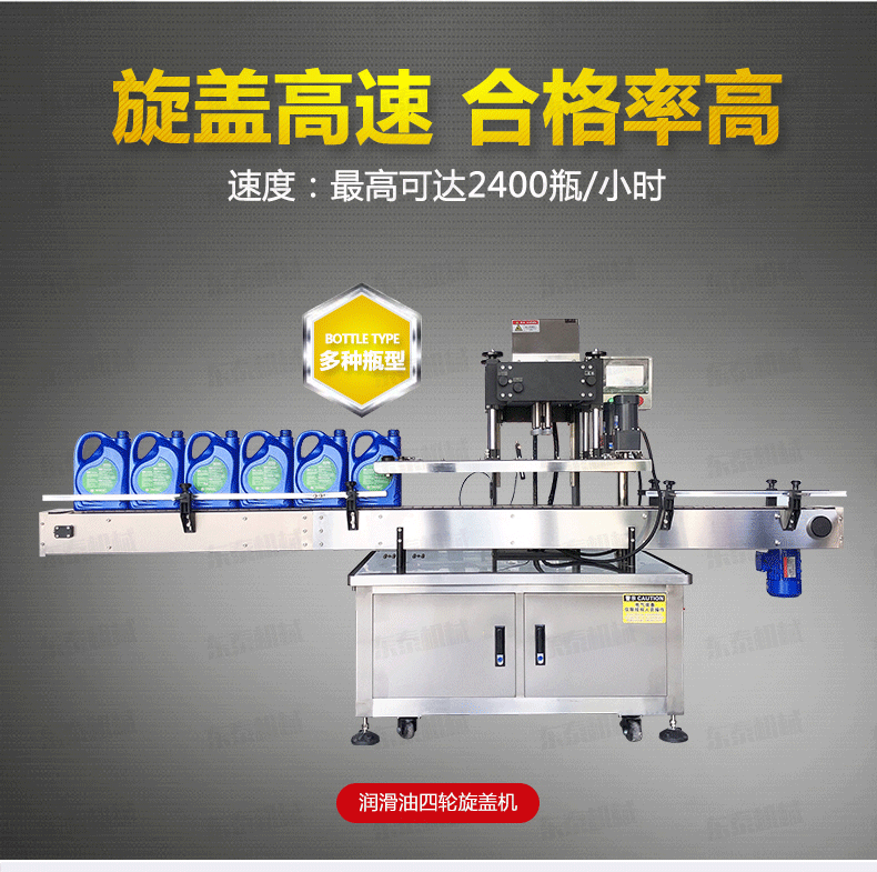 全自動旋蓋機是參照國機型改進設計、旋蓋速度快,合格率高、操作方便?蛇m用于食品、制藥、日化、農(nóng)藥、化妝品等行業(yè)的不同瓶形的旋蓋。四臺調(diào)速電機分別用于供蓋、夾瓶、傳送、旋蓋,機器自動化程度高,穩(wěn)定性好,調(diào)節(jié)方便,更換瓶形或蓋時無須備件,只需作調(diào)整即可完成(如配上蓋機,可進行自動上蓋)可以根據(jù)實際需要選配。