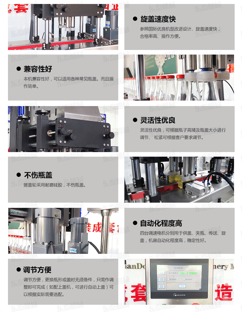 全自動旋蓋機是參照國機型改進設計、旋蓋速度快,合格率高、操作方便?蛇m用于食品、制藥、日化、農(nóng)藥、化妝品等行業(yè)的不同瓶形的旋蓋。四臺調(diào)速電機分別用于供蓋、夾瓶、傳送、旋蓋,機器自動化程度高