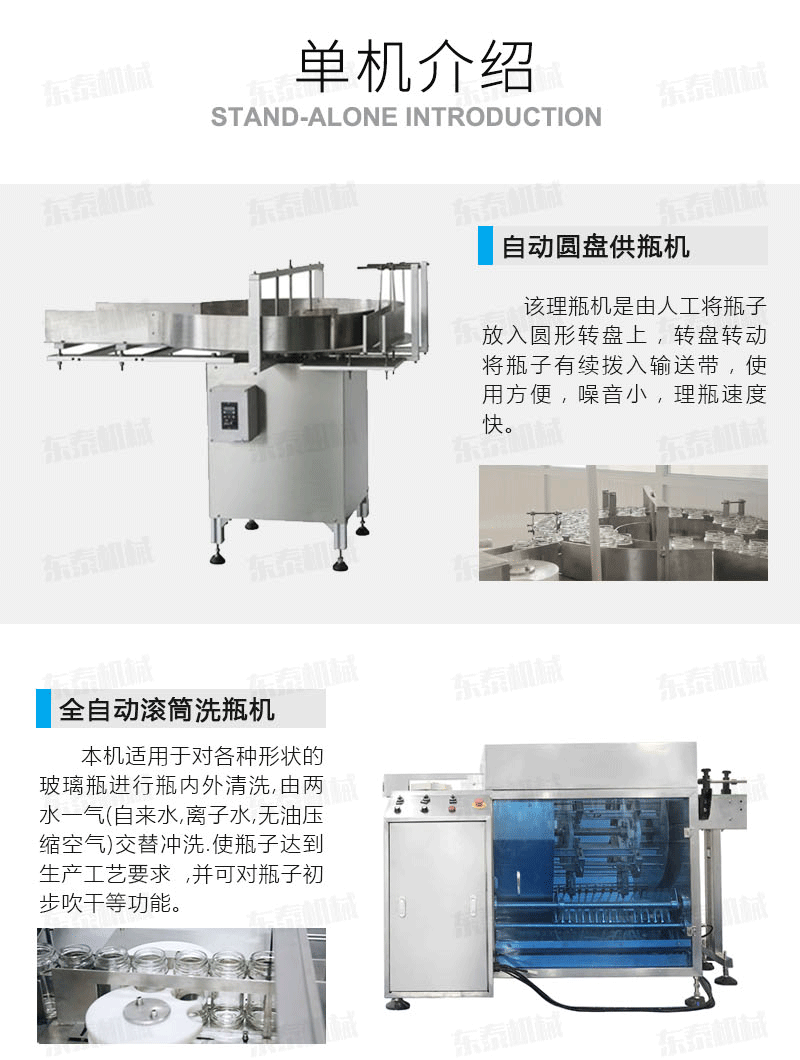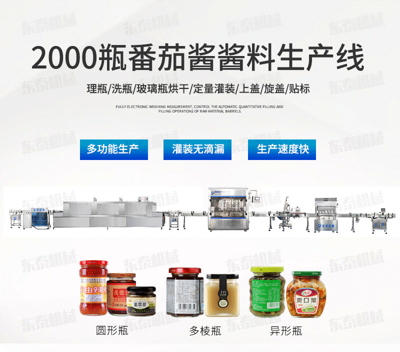番茄醬灌裝旋蓋生產(chǎn)設(shè)備組成: 自動(dòng)供瓶機(jī)+全自動(dòng)滾筒洗瓶機(jī)+自動(dòng)六米烘干機(jī)+自動(dòng)收瓶機(jī)+全自動(dòng)六頭灌裝機(jī)自動(dòng)灌裝+全自動(dòng)提蓋機(jī)自動(dòng)理蓋、提蓋、掛蓋+六頭真空旋蓋機(jī)同時(shí)六個(gè)頭真空旋蓋+套標(biāo)機(jī)+收縮
