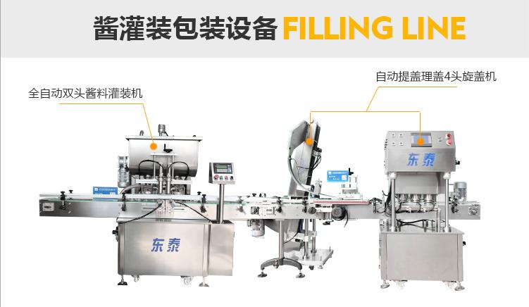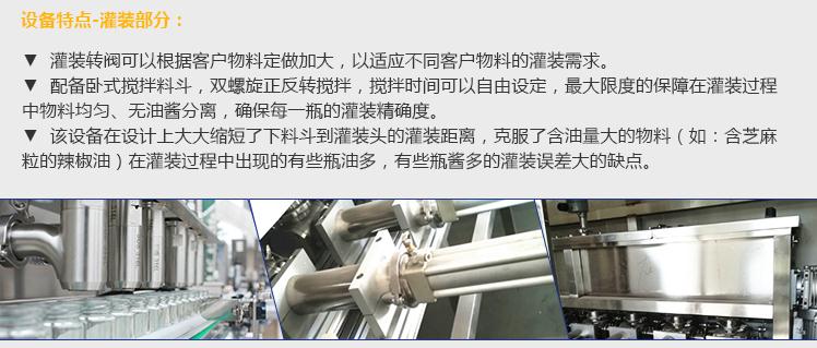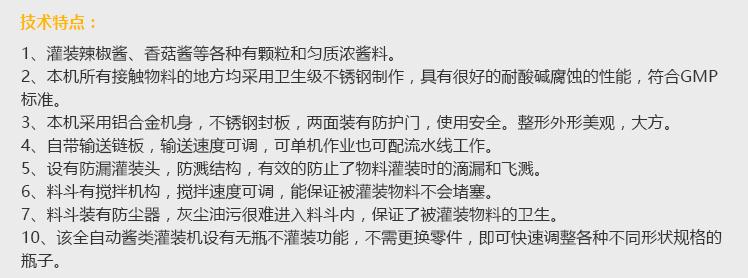 灌裝機(jī)采用活塞式灌裝原理,適用于調(diào)味品中帶顆粒并且濃度較大的辣椒醬、豆瓣醬、花生醬、香菇醬、果醬、牛油火鍋底料、紅油火鍋底料、蝦醬等較為粘稠醬類(lèi)的灌裝。