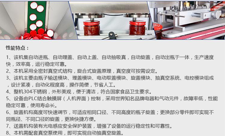 1、該機(jī)集自動(dòng)進(jìn)瓶、自動(dòng)理蓋、自動(dòng)上蓋、自動(dòng)抽吸真,自動(dòng)旋蓋,自動(dòng)出瓶于一體,生產(chǎn)速度快,效率高,運(yùn)行穩(wěn)定可靠。