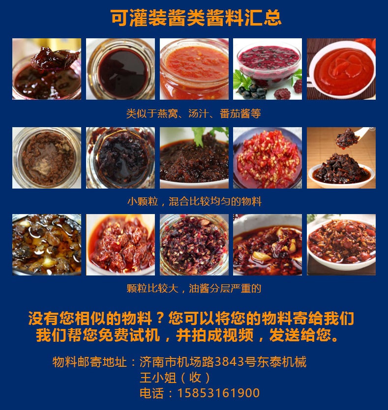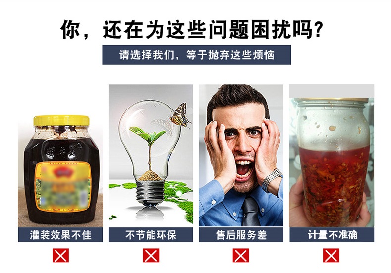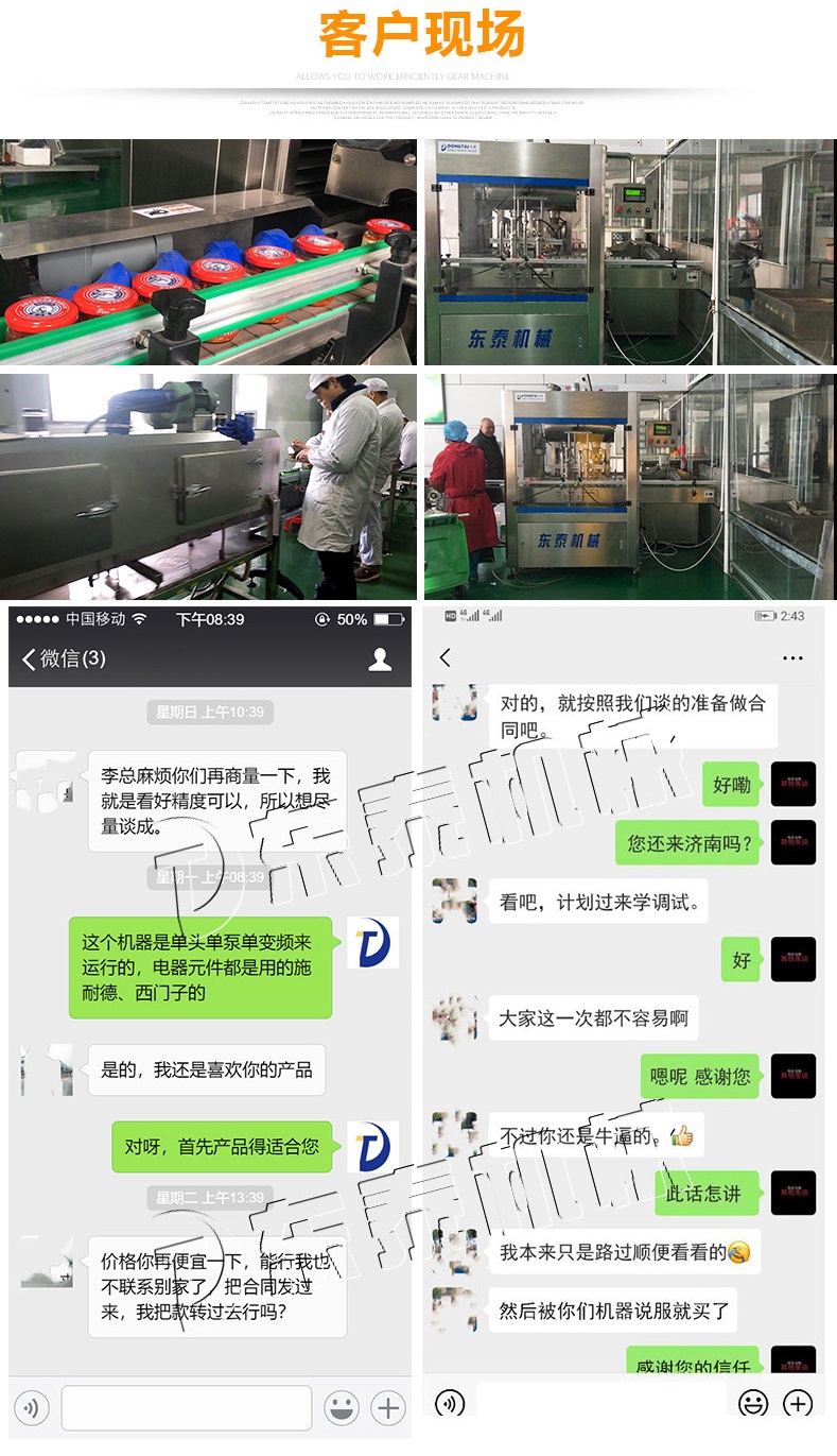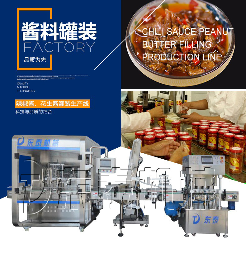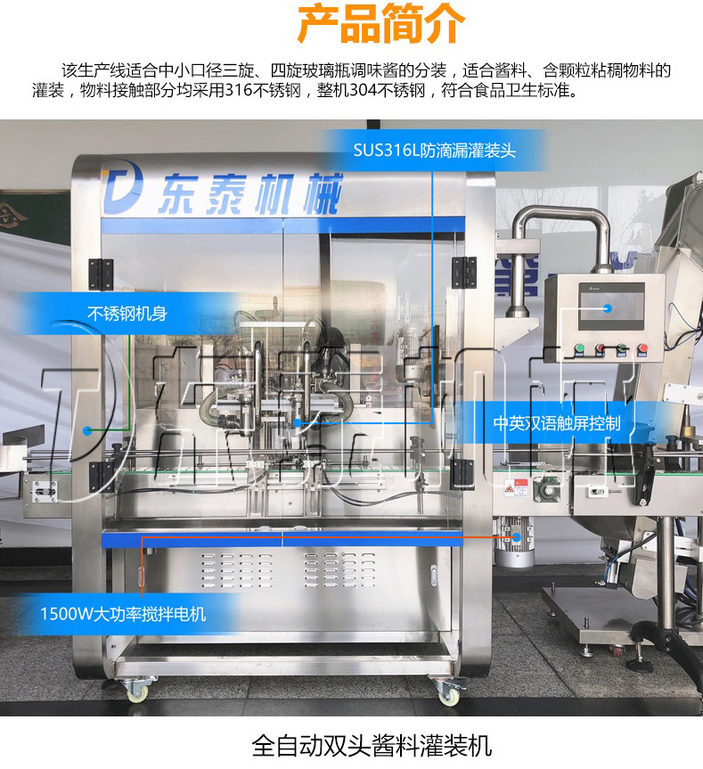 設備簡介 該生產線適合中小口徑三旋、四旋玻璃瓶調味醬的分裝,適合醬料、含顆粒黏稠物料的灌裝,物料接觸部分均采用316不銹鋼,整機304不銹鋼,符合食品衛(wèi)生標準。該機設計合理,機型小巧,立式結構,節(jié)省
