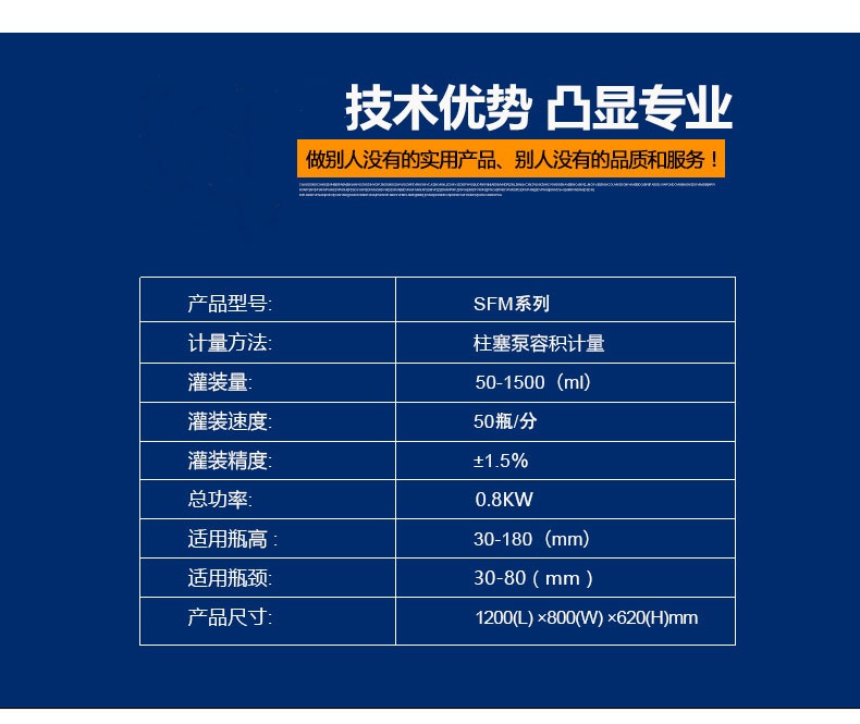 產(chǎn)品簡介:半自動醬類醬料灌裝機SFM系列結(jié)構(gòu)合理、機型小巧、性能可靠、定量準確、操作方便。整機304不銹鋼,灌裝悶頭防漏料防滴油,氣缸驅(qū)動結(jié)構(gòu),加大200L料斗,品牌全鋁殼銅芯大功率攪拌電機,變頻調(diào)速,PLC智能控制,用戶可根據(jù)需要任意調(diào)節(jié)灌裝量及灌裝速度,灌裝精度高。
