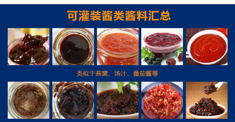此款醬類灌裝機為觸摸屏操作,由PLC控制,自動化程度高。主要適用于番茄醬、甜面醬、沙拉醬等醬類的灌裝。