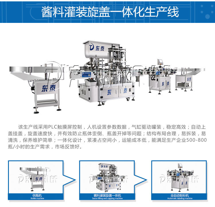 自動(dòng)化醬料灌裝機(jī)是專業(yè)根據(jù)辣椒醬、豆瓣醬、牛肉醬、芝麻醬、香菇醬、蝦醬等醬類所研發(fā)設(shè)計(jì)的,市場(chǎng)上這么多的商品都是要經(jīng)過包裝之后才能流通的,因此自動(dòng)化醬料灌裝機(jī)成為了現(xiàn)代化社會(huì)生產(chǎn)的新技術(shù),其經(jīng)過我們東泰多年的科技成果不斷改進(jìn)適用廣泛,在自動(dòng)化方面等等更是十分的人性化,當(dāng)前可以從各行業(yè)的產(chǎn)品生產(chǎn)來看都是可以選擇自動(dòng)化醬料灌裝機(jī)來進(jìn)行包裝的,該機(jī)依靠著我們東泰專業(yè)的技能占據(jù)著整個(gè)行業(yè)的重位,從而更好的滿足人們的消費(fèi)觀念